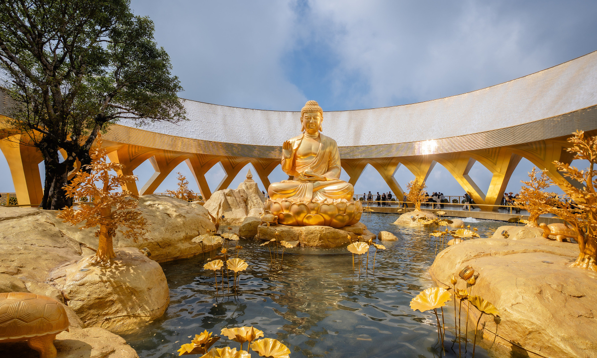 Tượng Đức Phật Câu Na Hàm Mâu Ni ngồi tướng kiết già (hay còn gọi là liên hoa tọa) giữa hồ sen vàng. Ảnh: Sun Group