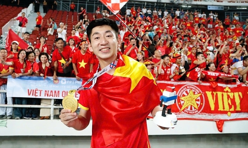 Nguyễn Nhật Minh mừng tấm HC vàng SEA Games 33 trước người hâm mộ, sau khi cùng Việt Nam thắng Thái Lan 3-2 ở chung kết trên sân Rajamangala ở Bangkok, Thái Lan ngày 18/12/2025. Ảnh:Đức Đồng