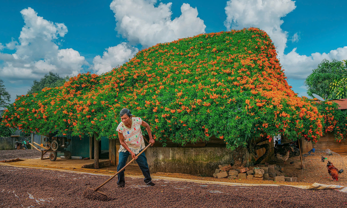Ngôi nhà gỗ rộng khoảng 60 m nằm ở Thôn B' Đơr, xã Bảo Lâm 2, nổi bật từ xa nhờ toàn bộ phần mái và tường phủ kín hoa chùm ớt.