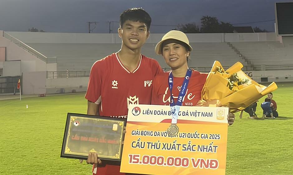 Chị Linh chia vui với con khi giành giải Cầu thủ xuất sắc nhất giải Vô địch U21 quốc gia 2025. Ảnh gia đình cung cấp
