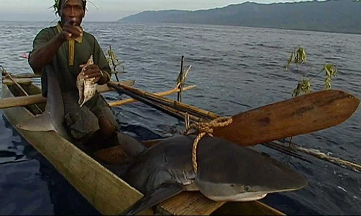 Đàn ông dân tộc Tanbin tại Papua New Guinea thực hiện nghi lễ bắt cá mập bằng tay không để chứng minh sức mạnh và bản lĩnh của bản thân.