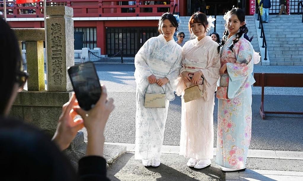 Du khách Trung Quốc mặc kimono chụp ảnh tại chùa Sensoji ở quận Asakusa, Tokyo. Ảnh: AFP